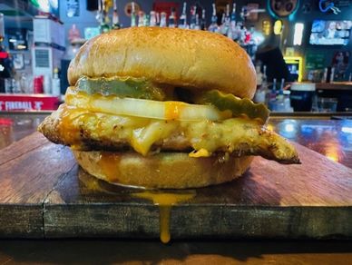 Ryan’s spicy grilled chicken sandwich. Fresh, grilled seasoned chicken topped with buffalo sauce, cayenne-jalapeño cheese, onions and pickles, served on a toasted glossy bun with fries 13.99